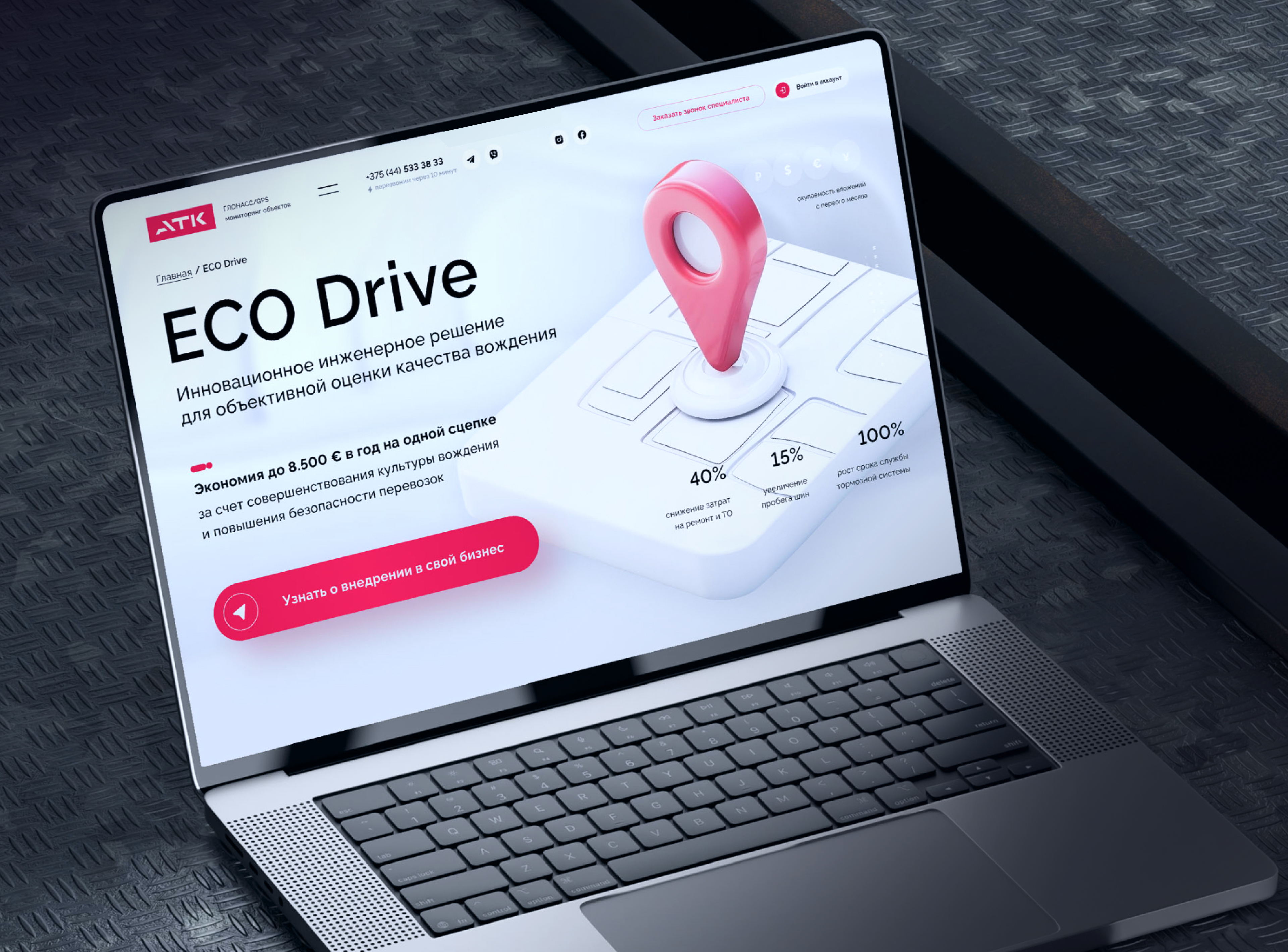 Солюшн: Аудит бизнес-логики / анализ болей B2B-клиентов / выявление точек экономической ценности: топливо, простои, дисциплина водителей, прозрачность данных. Пересборка архитектуры / сценарий «проблема → решение → механика → экономический эффект → контакт» / главная страница как управляемая воронка. Выделение ECO Drive в самостоятельную стратегическую ось / усиление роли инженерной аналитики / смещение фокуса с оборудования на управляемость автопарка. Разработка технологичного визуального стиля / строгая типографика / системная графика / акцент на цифрах и аналитике / минимализм без визуального шума.Инженерная frontend-реализация / оптимизированная архитектура проекта / адаптивная логика интерфейса / производительность под высокой графической нагрузкой / стабильная работа на мобильных устройствах B2B-аудитории.